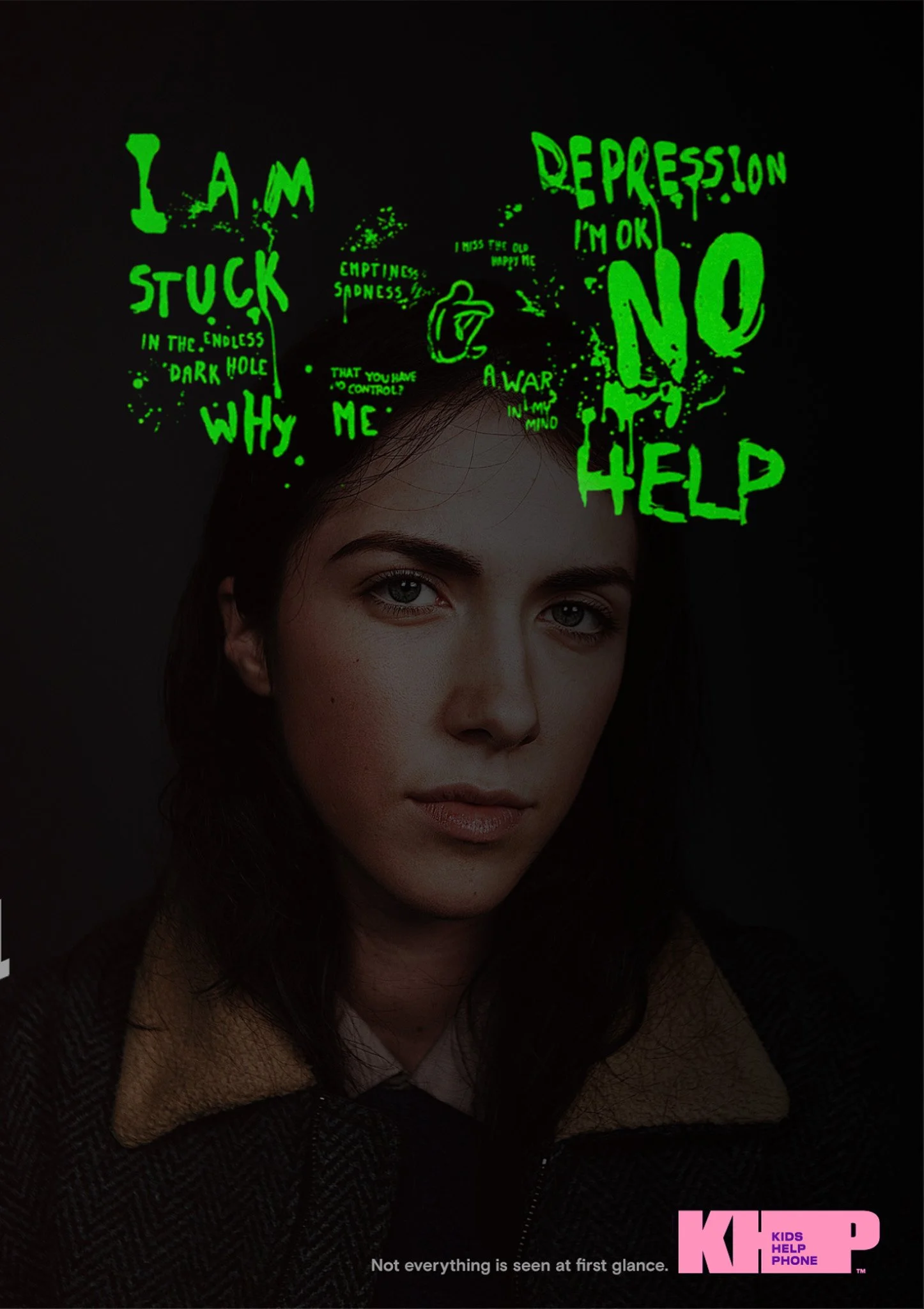 We talk about depression as something that only adult suffer from, the reality is depression hits 1 in 7 kids between 10 to 16 years old. Kids who suffer from depression tend to act like “normal” in public, but are privately tortured by tormented voices. To address this issue and make people aware we print posters of kids that look “happy” and hid messages that only appear at night when sufferers are most fragile. This images are printed with Glow-in-the-Dark ink, bringing readers the physical experience of understanding life with depression.